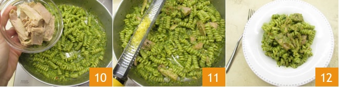 Agora adicione os filés de atum escorridos 10 e a casca de limão ralada 11. Uma última mexida antes de servir e desfrute imediatamente de sua massa com pesto de rúcula e atum 12.