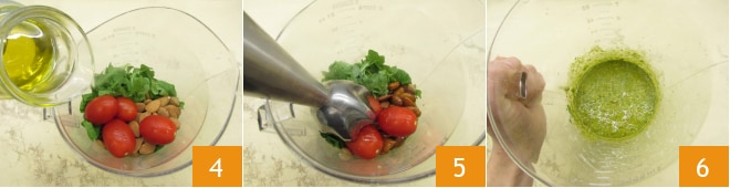 depois o óleo 4 e, por fim, o sal. Agora bata tudo 5 até obter um creme liso e homogêneo 6.