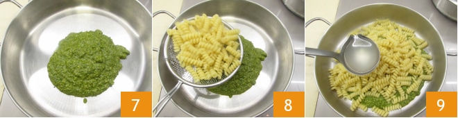 Coloque o pesto na panela sem acender o fogo 7 e assim que a massa estiver al dente, escorra diretamente na frigideira 8. Adicione uma concha da água de cozimento da massa para diluir a mistura e misture 9.