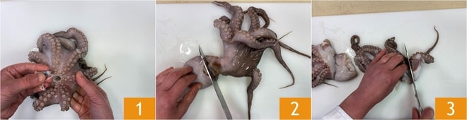 Para preparar a massa com polvo e abobrinha a primeira coisa a fazer é cuidar da Como limpar e cozinhar o polvo: remova o bico empurrando-o para fora 1, depois separe a cabeça bem limpa do resto do corpo 2 e corte-a em pedaços. Elimine a parte com os olhos e divida os tentáculos, separando-os com uma faca 3.