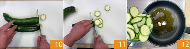 Enquanto isso, prepare também as abobrinhas: lave-as bem e corte as pontas 10, depois corte-as em rodelas 11. Em uma frigideira, coloque um fio de azeite e um dente de alho esmagado. Aqueça e adicione as abobrinhas 12.