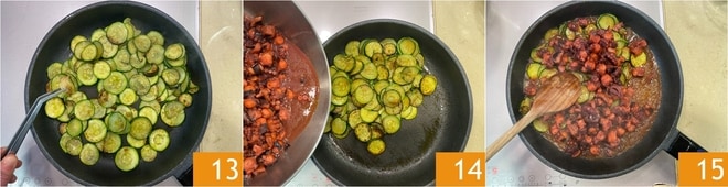 Salteie as abobrinhas por cerca de dez minutos até que estejam bem douradas. Então, elimine o dente de alho 13. Transfira o polvo para a frigideira 14 e termine de cozinhar até obter um molho espesso 15.