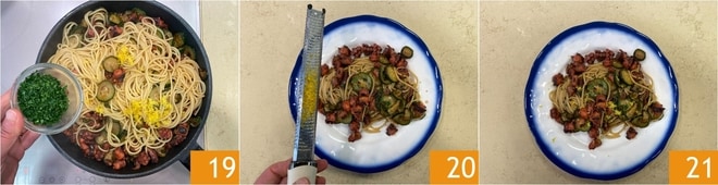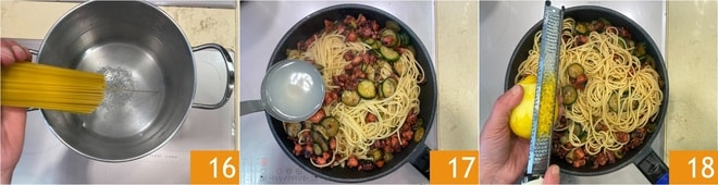 Enquanto isso, cozinhe os spaghetti em água salgada fervente 16. Escorra-os ao dente e transfira diretamente para a frigideira com o molho, junto com uma concha da água de cocção da massa 17. Adicione a casca de limão 18.