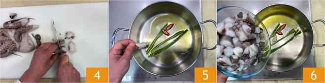 Reduza também estes a pedaços de cerca de 2 cm 4. Em uma panela, coloque um fio de azeite, 3-4 talos de salsinha, uma pimenta cortada ao meio e um dente de alho com casca 5. Deixe dourar, depois adicione o polvo em pedaços 6.