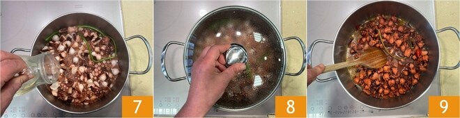 Aumente o fogo e cozinhe até que mude de cor, depois adicione o vinho branco 7 e deixe evaporar completamente. Cubra com uma tampa 8 e cozinhe em fogo baixo por 40 minutos. Em seguida, remova o alho e os talos de salsa 9.