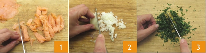 Para preparar a massa com salmão, primeiro coloque uma panela de água para ferver e cozinhe a massa, adicione sal quando ferver. Corte o salmão em tiras 1; não corte o salmão em pedaços muito pequenos, senão eles vão se desmanchar na panela. Descasque e pique finamente a cebola 2, depois pique também a salsinha 3.