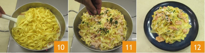 Ligue novamente o fogo e mexa bem para reduzir o molho 10. Complete com a salsinha picada e uma pitada de pimenta 11 e sirva imediatamente sua massa com salmão defumado 12!