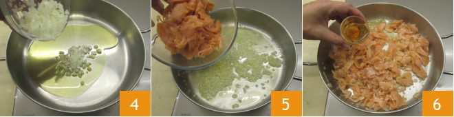 Aqueça o óleo em uma panela e refogue a cebola 4, depois adicione o salmão 5 e aumente o fogo. Após saltear o salmão por alguns minutos, adicione o conhaque 6 e deixe evaporar completamente, depois desligue o fogo.