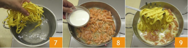 Neste ponto, a água estará fervendo, então adicione sal e cozinhe o fettuccine pelo tempo indicado na embalagem 7. Enquanto isso, coloque o creme de leite na panela com o salmão, ainda com o fogo desligado 8. Quando o fettuccine estiver cozido, escorra e transfira diretamente para a panela 9.