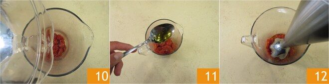 Enquanto isso, os tomatinhos estarão cozidos: retire cerca de 3/4 do total, coloque-os em um copo alto, adicione água 10 e 2 colheres de sopa de azeite de oliva extravirgem 11 e bata no liquidificador 12.