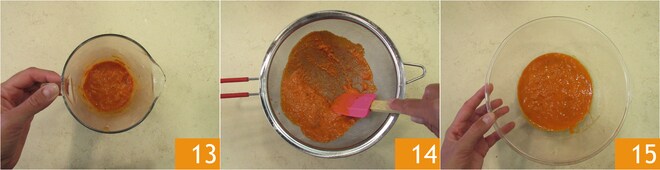 A consistência final deve ser um creme 13, que deve ser passado por uma peneira 14. A coulis de tomatinhos está pronta 15.