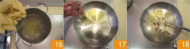 Cozinhe os penne 16 e escorra-os 3 minutos antes do término do cozimento. Enquanto isso, em uma frigideira grande, coloque o azeite de oliva extravirgem, o alho sem casca e as anchovas 17. Deixe derreter, mexendo, e depois remova o alho 18.