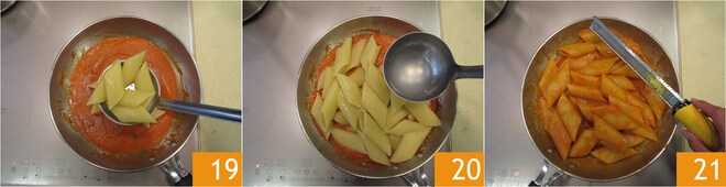 Você pode então adicionar a coulis e mexer, depois escorra os penne 19, adicione água de cozimento, se necessário 20, e termine o cozimento dos penne. Quando estiverem prontos, desligue o fogo e aromatize com as raspas de limão 21. Você também pode adicionar um fio de azeite.