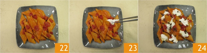 Sirva a massa em um belo prato, dispondo de forma dispersa os tomatinhos reservados 22 e a stracciatella de burrata 23. Termine esfarelando as alcaparras fritas 24!
