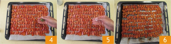 Polvilhe com orégano 4, sal 5 e açúcar 6. Asse em forno estático pré-aquecido a 200° por cerca de 30-40 minutos: ao final do cozimento, eles devem estar caramelizados, murchos e bem tostados.
