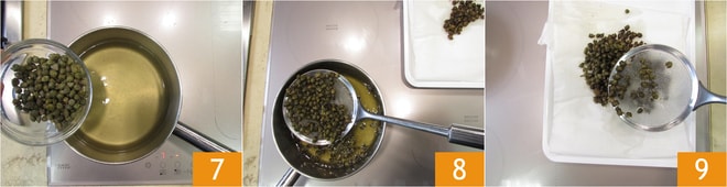Para as alcaparras: enxágue-as sob água corrente para eliminar o excesso de sal, seque-as para remover o máximo de água possível. Em uma panela pequena e de bordas altas, aqueça o óleo de sementes a 175°. Frite as alcaparras por alguns minutos 7 e escorra em papel absorvente, assim que estiverem bem crocantes 8 9.