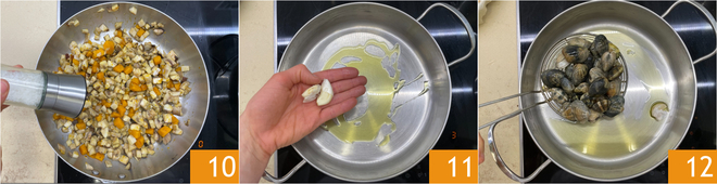 Desligue o fogo, ajuste o sal 10 e a pimenta e reserve. Após o tempo de molho das vôngole, tempere em uma panela grande um fio de azeite com 2 dentes de alho amassados 11, depois adicione as vôngole 12.