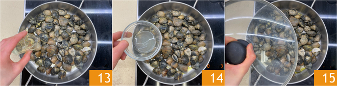 Mantenha o fogo alto e evapore primeiro com o vinho branco 13 e depois com o suco de limão 14. Cubra com a tampa 15 e espere que se abram.
