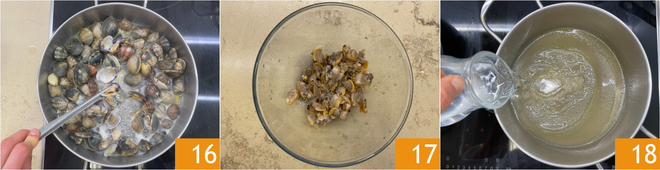 Quando as vôngole estiverem abertas 16, desligue o fogo e separe os mariscos das conchas, reservando algumas inteiras para a apresentação 17. Coe o líquido de cozimento em uma panela e adicione cerca de 100 g de água 18.