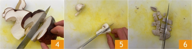 Limpe também os cogumelos: corte os porcini primeiro em fatias 4 e depois em cubos do mesmo tamanho da abóbora. Corte os champignons 5 e os pleurotus em pedaços 6.