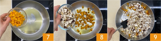 Em uma panela, aqueça com um fio de azeite, depois adicione a abóbora 7 e refogue em fogo alto por cerca de 10 minutos. Junte também os cogumelos 8 e continue refogando por mais 5-7 minutos, mexendo frequentemente, até que os vegetais estejam cozidos, mas ainda crocantes.