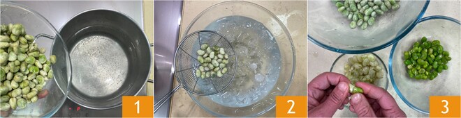 Para preparar a pasta cremosa com favas, primeiro descasque as favas e leve uma panela de água salgada para ferver; você deve obter cerca de 300 g de favas descascadas. Escalde as favas por 2-3 minutos 1, depois escorra e transfira para uma tigela com água e gelo para interromper o cozimento e manter a cor viva 2. Uma vez resfriadas, descasque as favas removendo a pele externa 3.
