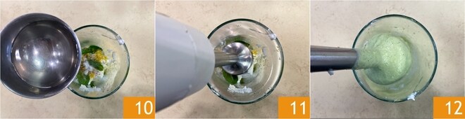 Ajuste a consistência com um pouco de água 10, depois misture com um mixer de imersão 11 para obter um creme liso e sedoso 12.