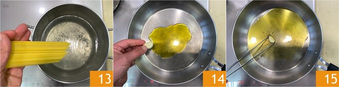 Neste ponto, cozinhe as linguine al dente em água fervente salgada 13. Enquanto isso, em uma frigideira, aqueça um fio de óleo com um dente de alho por alguns minutos 14, depois remova-o 15.