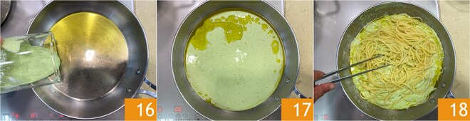 Despeje o creme de favas 16 e aqueça em fogo brando, mexendo sempre 17. Escorra a massa aqui e salteie brevemente tudo 18; se necessário, você pode adicionar um pouco da água do cozimento para misturar. Quando a massa estiver bem mantecada, desligue o fogo.