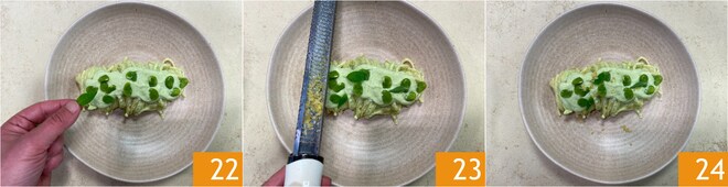 Perfume com algumas folhas de manjericão e hortelã 22 e com raspas de limão 23. Sua pasta cremosa com favas está pronta para ser servida 24!