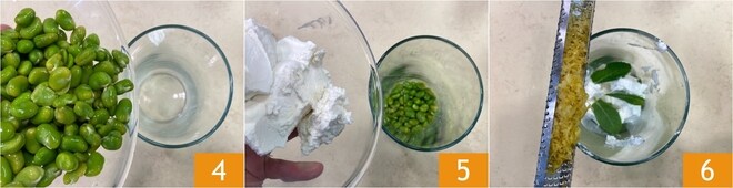 Coloque as favas em um recipiente, reservando algumas inteiras para a apresentação 4. Adicione a ricota 5, depois aromatize com as folhas de manjericão, folhas de hortelã e as raspas de limão 6.