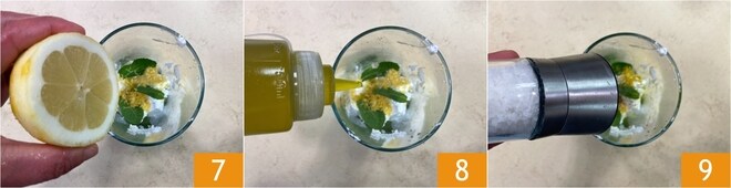 Adicione também o suco de limão 7, 2 colheres de sopa de óleo 8, o sal 9 e a pimenta.