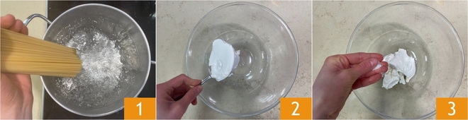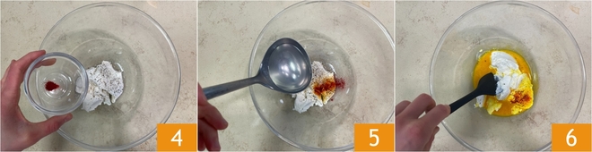 Adicione o açafrão 4 e uma concha da água de cozimento da massa 5, depois misture tudo 6 até obter um creme macio e homogêneo.