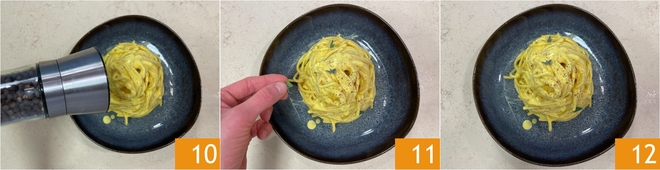 Finalize com pimenta moída 10 e algumas folhinhas de sálvia 11. Sua massa cremosa de ricota e açafrão está pronta para ser servida 12!