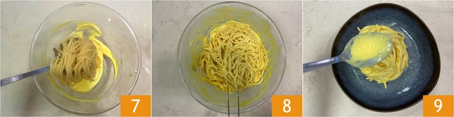 Quando a massa estiver no ponto, escorra-a diretamente na tigela 7 e misture bem ao molho 8; se necessário, você pode acrescentar um pouco mais da água de cozimento. Sirva o espaguete em pratos e cubra com bastante molho 9.