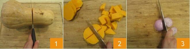 Para preparar a massa de forno com abóbora e bechamel de stracchino, comece limpando a abóbora. Descasque-a 1, retire os fios com as sementes e depois corte em pedaços grandes. Você obterá 500 g de abóbora limpa 2. Em seguida, limpe a cebola e corte-a em rodelas 3.