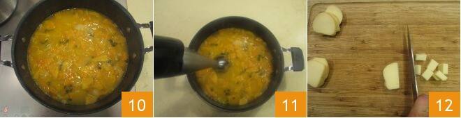 Após esse tempo, retire a tampa e ajuste o sal e a pimenta, aumente o fogo e cozinhe por mais 7-8 minutos 10. Ao final do cozimento, desligue o fogo e faça um creme com o mixer de imersão 11. Reserve o creme e cuide da scamorza defumada, cortando-a em cubos de aproximadamente dois centímetros 12.