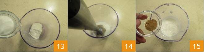 Agora passe para o bechamel de stracchino. Em uma tigela, coloque o stracchino junto com o leite 13, acione o mixer de imersão 14 e obtenha um creme homogêneo. Depois ajuste o sal e a noz-moscada ralada e misture 15.