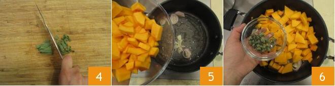 Por último, corte também a sálvia em tirinhas 4. Agora que tudo está pronto, passamos para o cozimento. Em uma panela, aqueça um fio de azeite junto com a cebola. Após alguns instantes, adicione também a abóbora 5 e a sálvia 6.