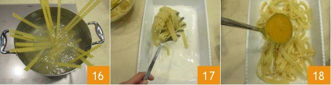 Neste ponto, você pode cozinhar a massa em água fervente salgada, cuidando de escorrê-la na metade do tempo de cozimento 16. Coloque-a em um recipiente e, em seguida, numa travessa de 36,5x24 cm, na qual você já colocou um pouco de bechamel de stracchino 17. Polvilhe a superfície com um pouco de creme de abóbora 18,