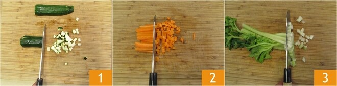 Para preparar a massa com molho branco de soja, a primeira coisa a fazer é cuidar dos legumes: lave-os todos. Corte a ponta da abobrinha e corte-a em cubos 1, depois descasque a cenoura e corte-a do mesmo tamanho 2. Corte também os talos de aipo em cubos 3.