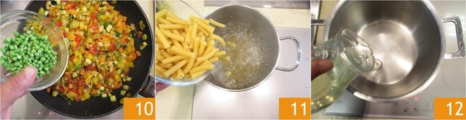 Adicione as ervilhas 10 e cozinhe por mais 2-3 minutos. Enquanto isso, coloque a água para a massa no fogo, quando estiver fervendo, adicione sal e a massa 11. Enquanto a massa cozinha, prepare o molho branco. Aqueça o leite de soja. Em uma panela pequena, coloque o óleo 12.
