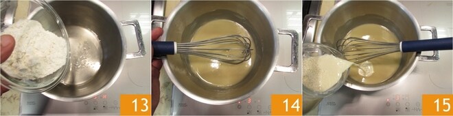 Adicione também a farinha 13, misture com um batedor e leve ao fogo. Continue mexendo até obter o clássico roux 14. Adicione o leite quente aos poucos 15.