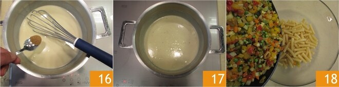 Acrescente uma pitada de noz-moscada 16 e termine o cozimento até que o molho esteja espesso, continuando a mexer 17. Escorra a massa ainda bem al dente e transfira-a para uma tigela. Adicione os legumes 18.