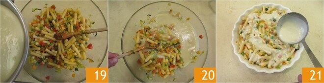 Adicione também o molho branco, reservando algumas conchas 19 e misture bem 20. Transfira para uma travessa de forno e adicione o molho branco restante por cima 21.
