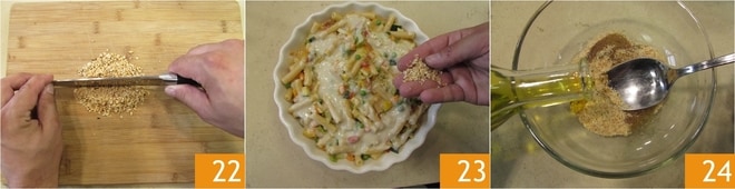Triture finamente as avelãs 22 e coloque-as sobre a massa 23. Transfira para uma tigela a farinha de rosca e adicione um fio de azeite 24.