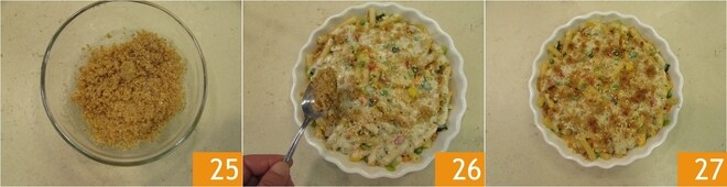 Misture bem 25 e polvilhe a mistura sobre a massa 26. Gratine por 5 minutos em forno pré-aquecido a 240° em modo grill, retire do forno e sirva 27.
