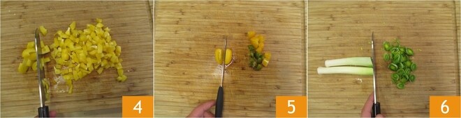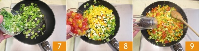 Passe para o pimentão, elimine sementes e filamentos internos, depois corte-o em cubos 4. Pegue os tomatinhos e corte-os do mesmo tamanho 5. Agora corte o alho-poró em rodelas 6.