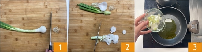 Para preparar a massa e ervilhas cremosa, comece colocando no fogo uma panela cheia de água, salgada a gosto, que servirá para cozinhar a massa. Passe para a cebolinha: elimine a parte inferior com as raízes 1 e a parte verde. Elimine a parte mais externa e corte em rodelas 2. Em uma panela, adicione um fio de óleo e acrescente a cebolinha 3.