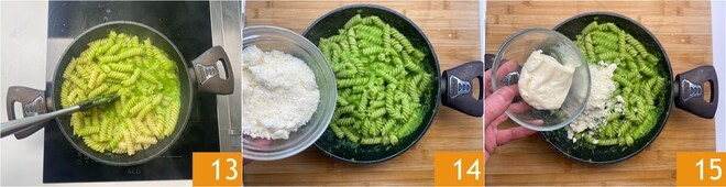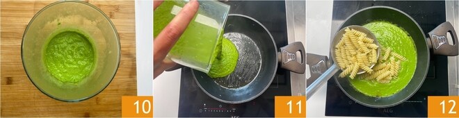 Uma vez obtido um creme 10, transfira-o novamente para a panela 11. Escorra os fusilli al dente e adicione-os ao molho 12.